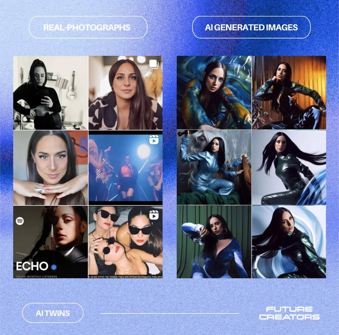 In this project, I explored the capability to generate images of a "digital twin" for ECHO, an Israeli singer. The goal was to find an image suitable for releasing a song without the necessity of a physical photoshoot. Throughout the process, I employed Midjourney to generate initial images that established the desired mood and style. Then, I incorporated the singer's face and other distinctive features using additional AI tools and add-ons, creating a set of photographs she can use.
